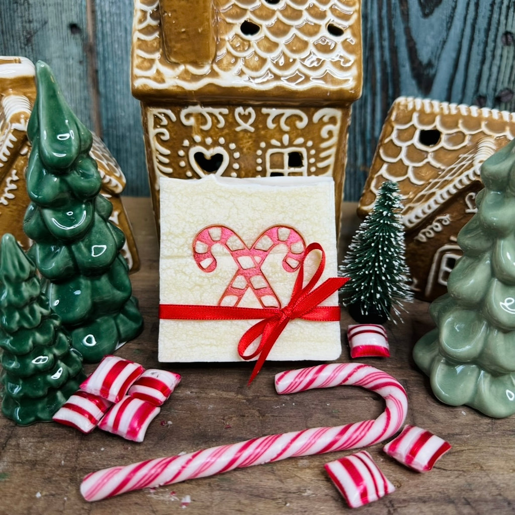 Diese weiße Mangobutterseife ist bestempelt mit schimmernder roter Zuckerstange und verziert mit rotem Schleifchen und kleinem Zuckerl-Papierkärtchen.