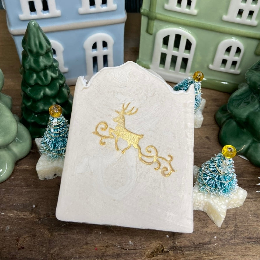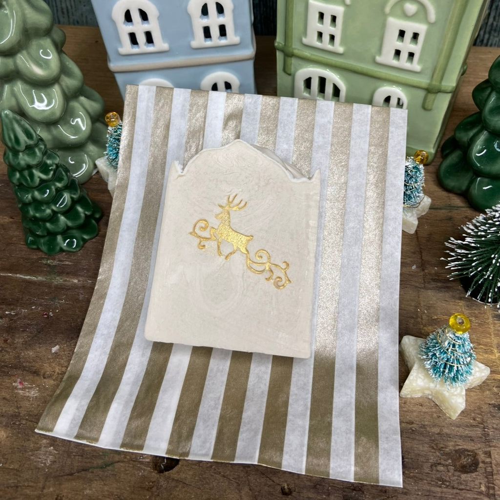 Diese wunderbar nach Zimtstern duftende Seife ist bestempelt mit goldenem Rentier und verpackt im hübschen Papiertütchen.