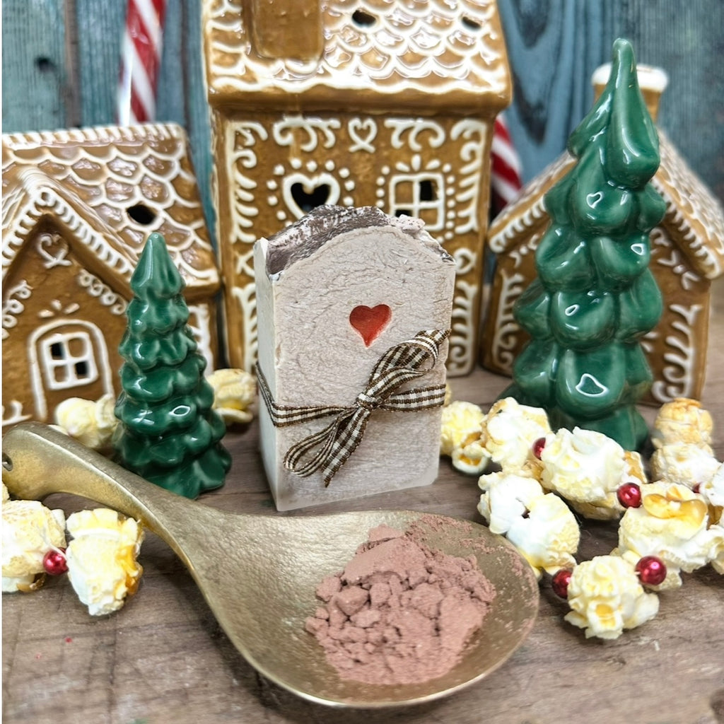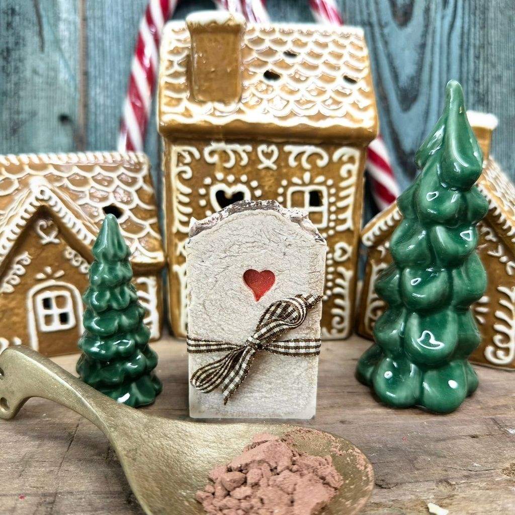 Diese himmlisch duftende Schokoladenseife ist bestempelt mit rotem Herzchen und verziert mit Schleifchen.