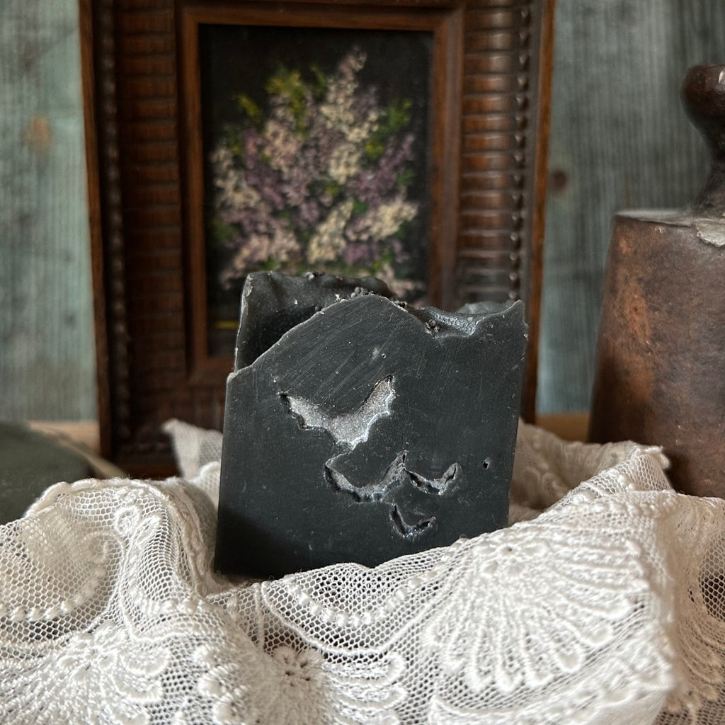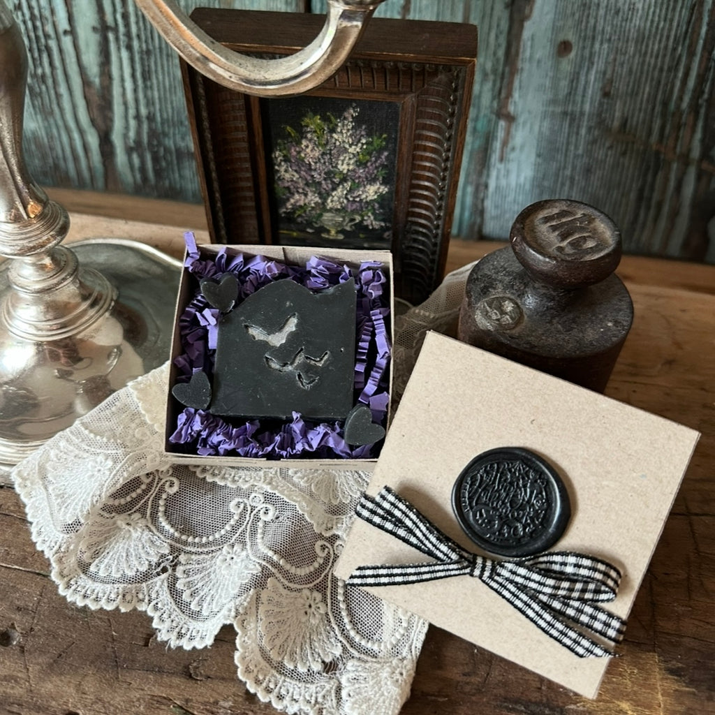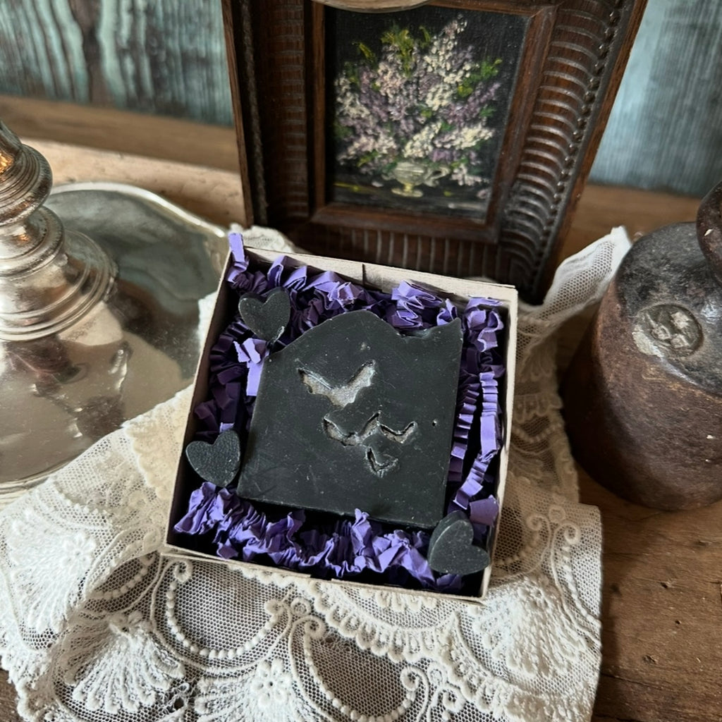 Dieses schöne Seifenstück ist bestempelt mit kleinen silbernen Fledermäusen und drei schwarze kleine Seifenherzchen.