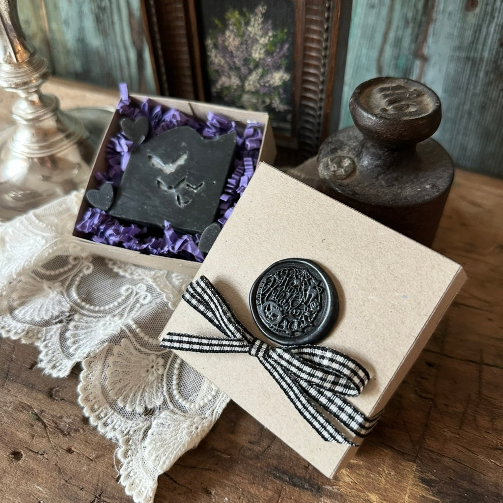 Die Seife ist verpackt im hübschen Geschenkkarton, ein schönes Geschenk um jemanden eine „schaurig schöne“ Freude zu bereiten oder sich selbst etwas Gutes zu tun!