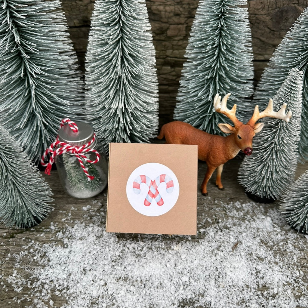 Dieses Geschenkerl beinhaltet eine weiße Zimtsternseife, bestempelt mit goldenem Rentier.