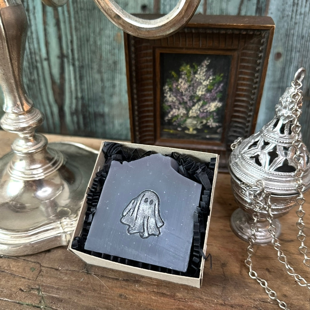 Diese schöne grau/lila Seife ist eine Mangobutter Seife und bestempelt mit kleinem schimmerden Gespenst.