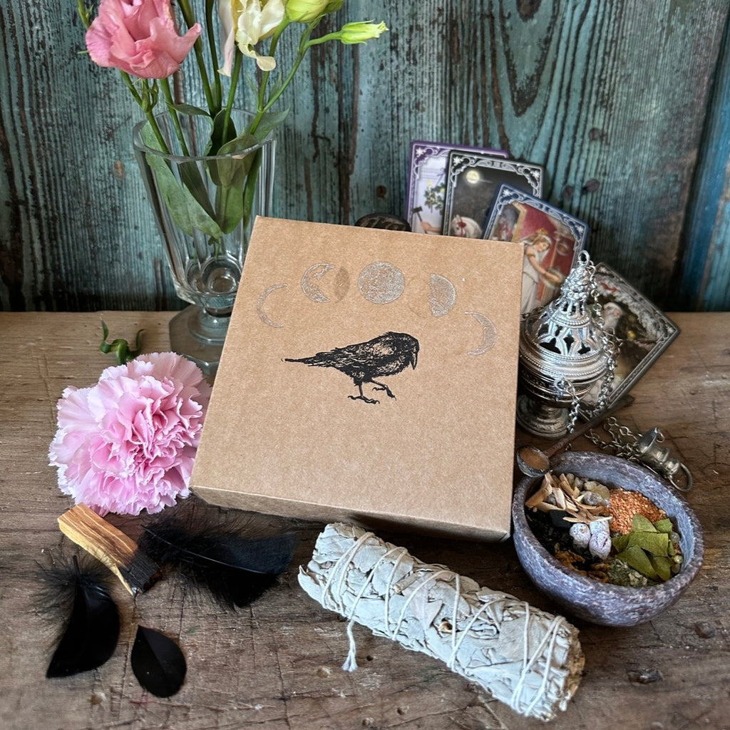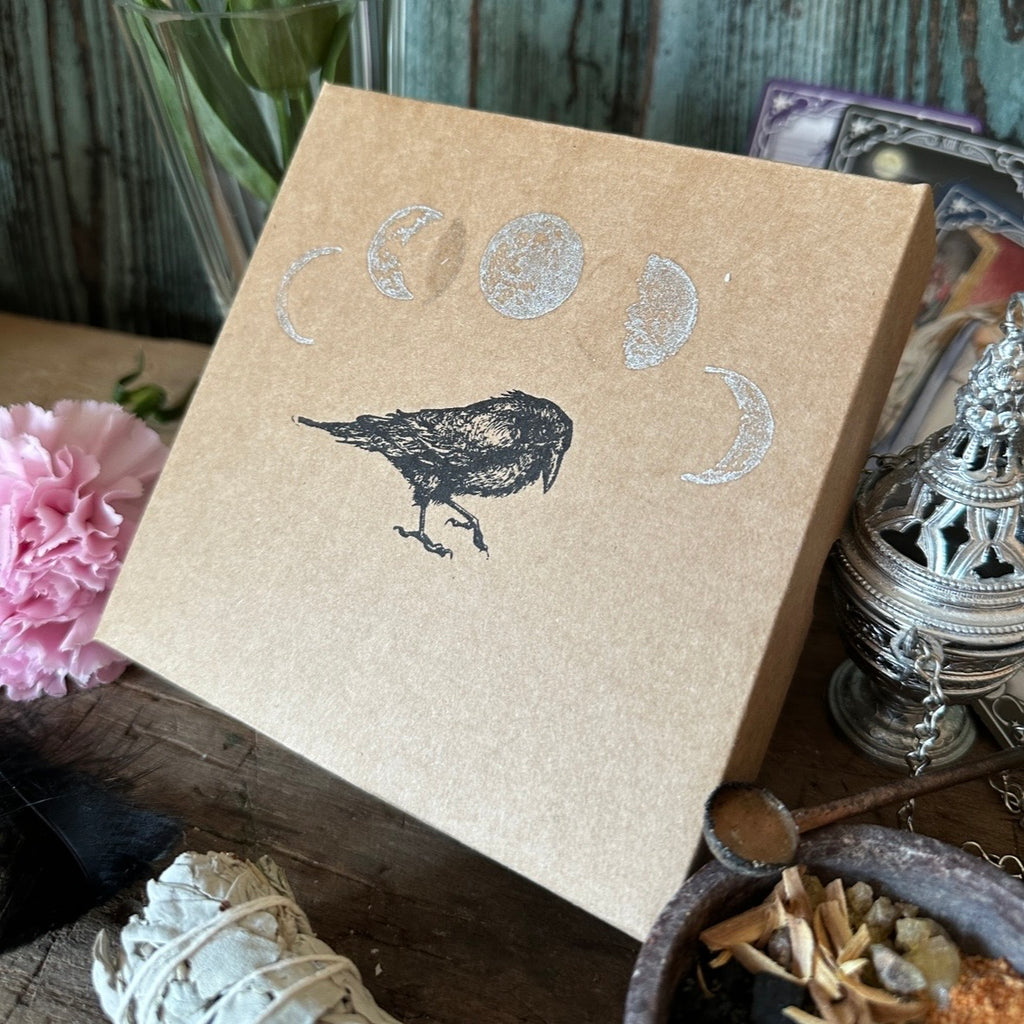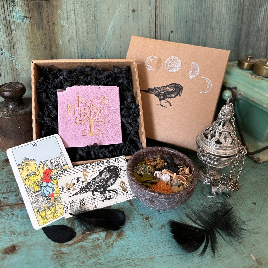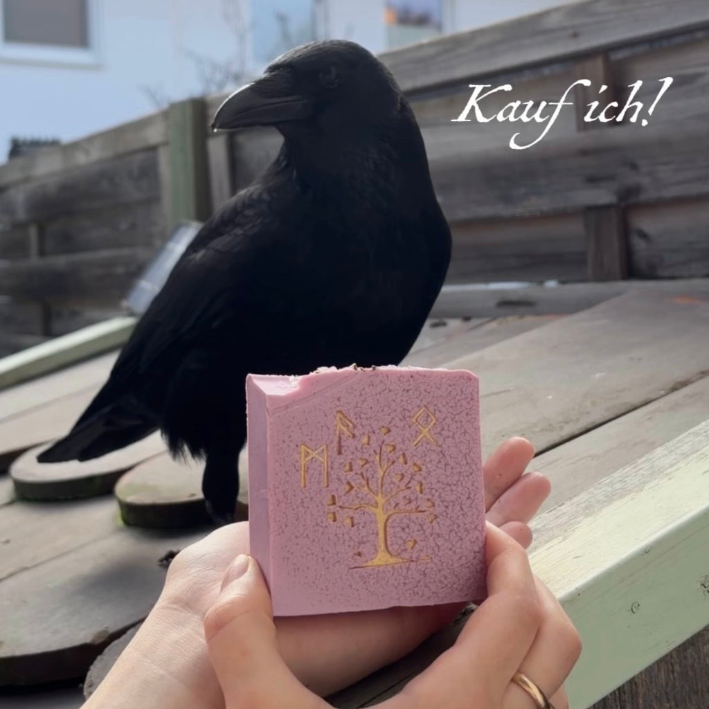 Dieses Seifenset beinhaltet eine Rauhnachtseife, eine zufällig gezogene Tarotkarte, ein kleines Kärtchen mit einem Raben bestempelt und deinen drei zufälligen goldenen Runen, sowie eine schwarze "Rabenfeder".