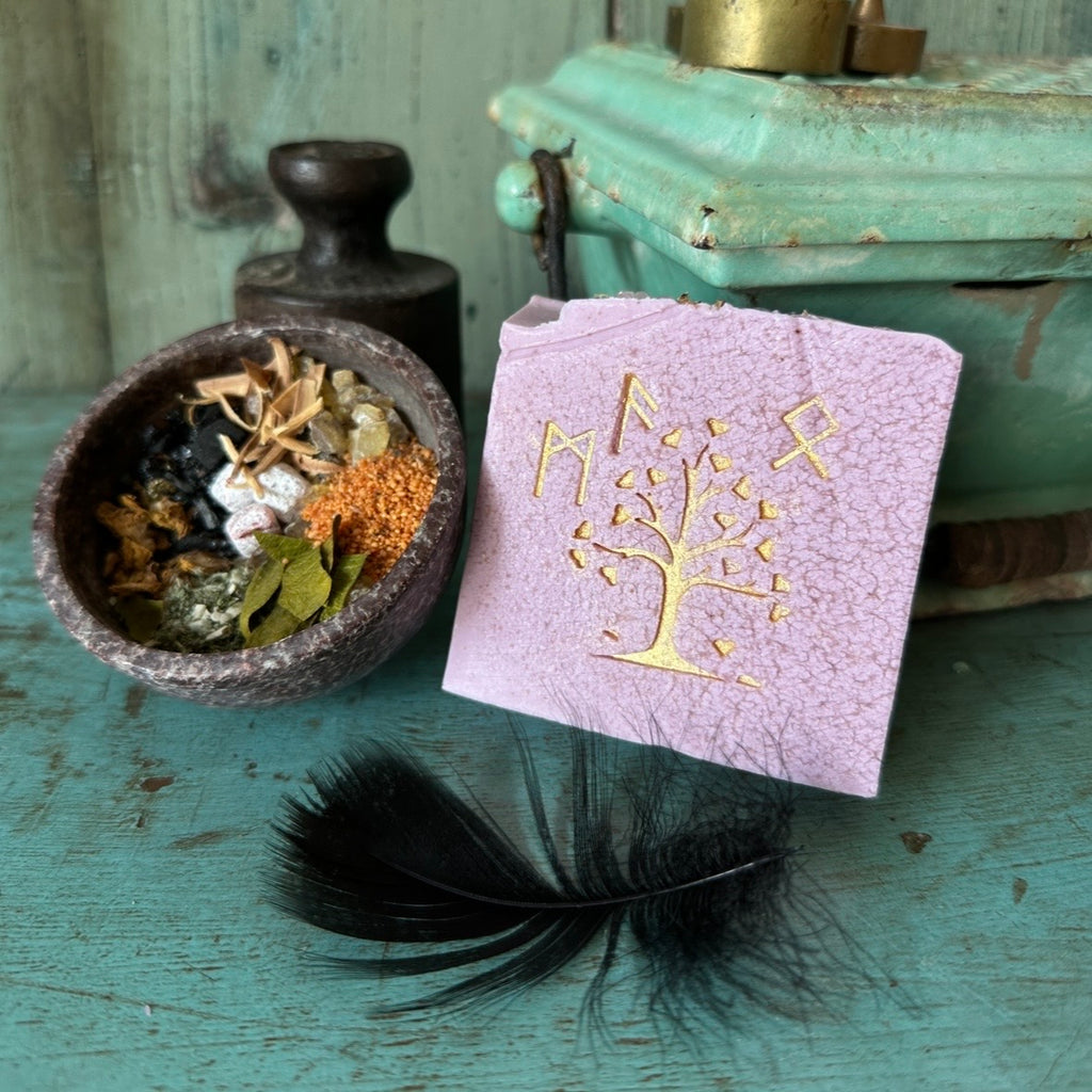 Die Seife ist verziert mit kleinen Amethysten, Wacholderholz und Rosenquarz, und bestempelt mit drei zufälligen Runen.