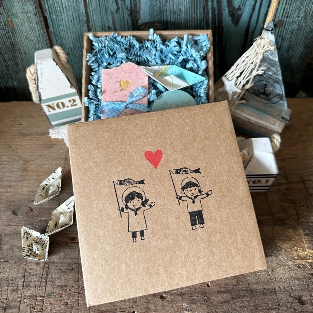 Die Seifchen sind verziert mit Schleifchen und Stempel und verpackt im wunderschön bestempelten Geschenkkarton.
