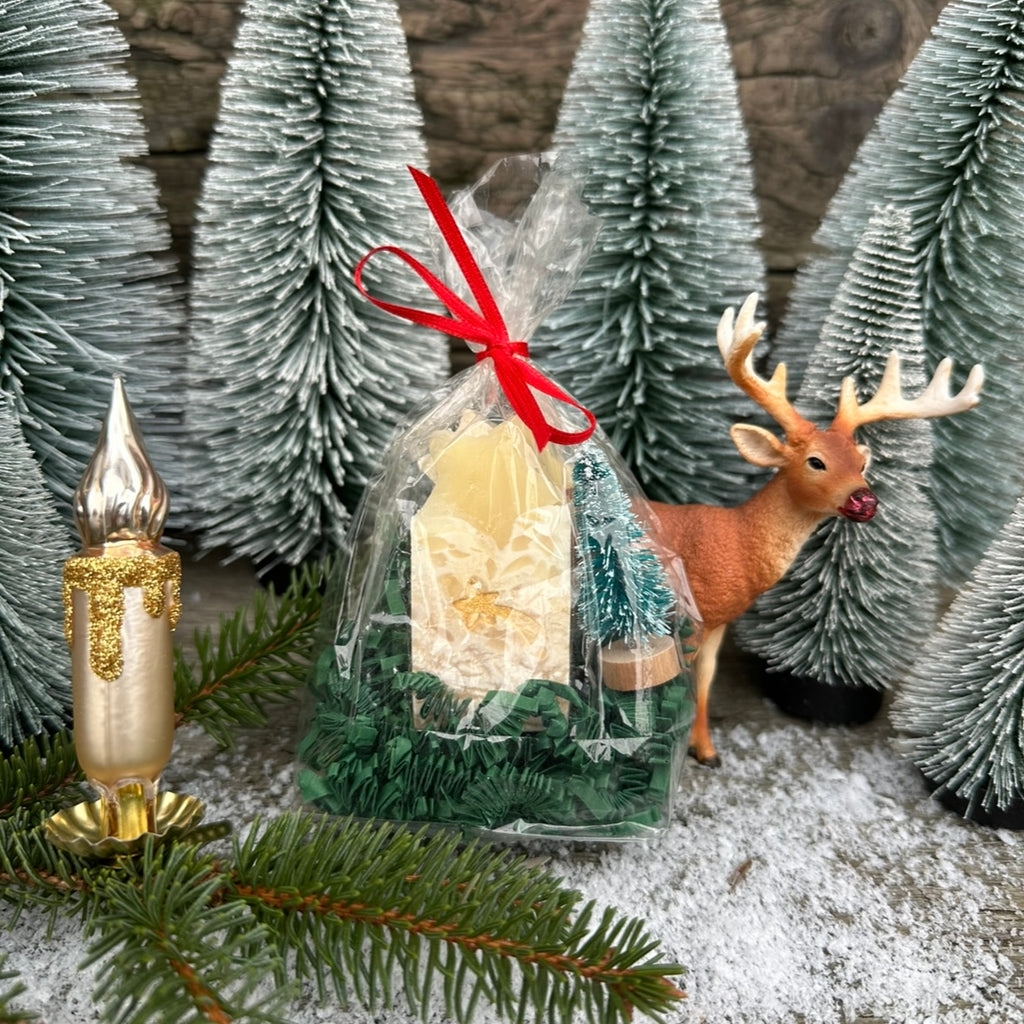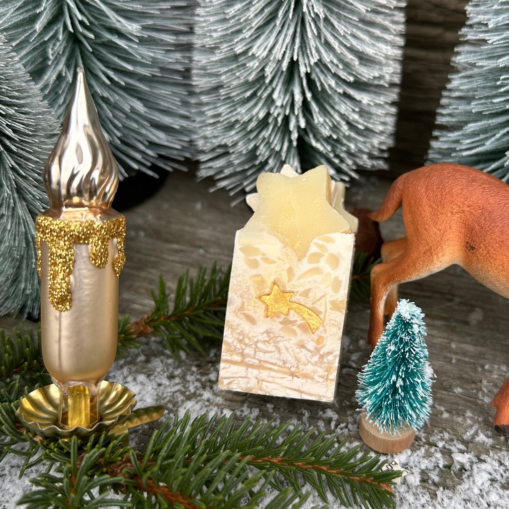 Das Geschenkerl beinhaltet eine kleine, duftende Sternthaler-Seife, die mit goldenem Stern bestempelt ist und ein kleines Deko-Tannenbäumchen.