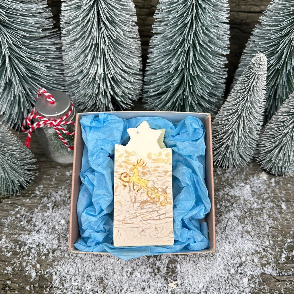 Dieses hübsche Sternthaler-Seifchen duftet nach warmen Wintergewürzen und ist bestempelt mit goldenem Rentier.