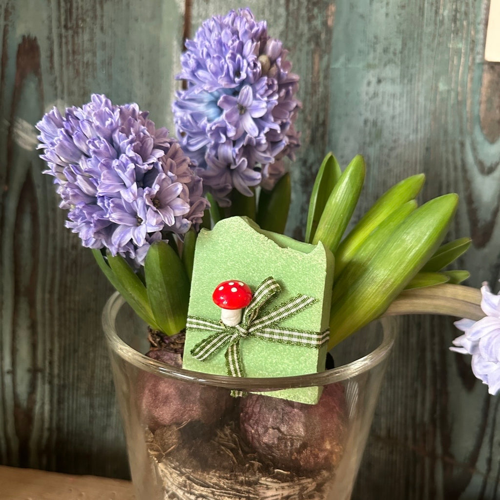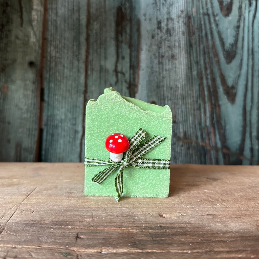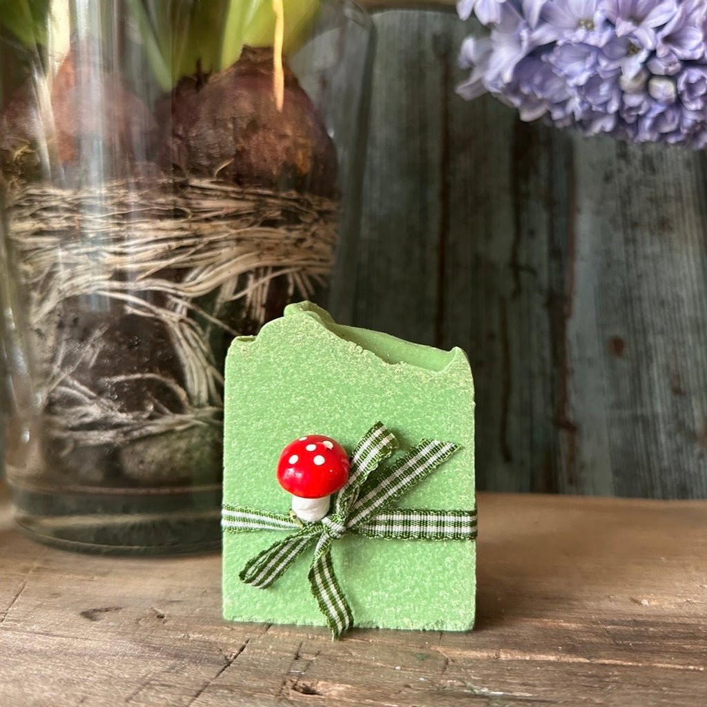 Die Seife ist verziert mit hübschen Schleifchen und lustigem Fliegenpilz.